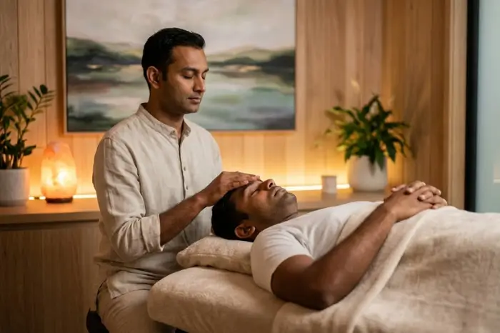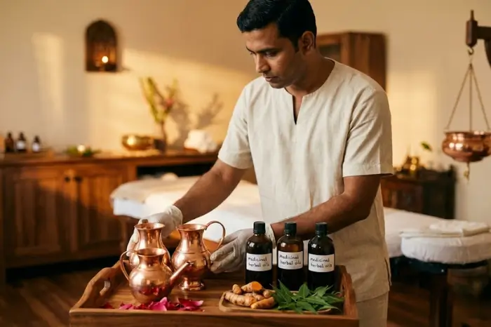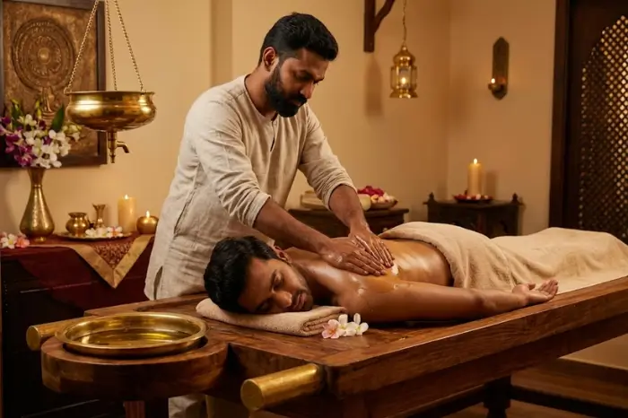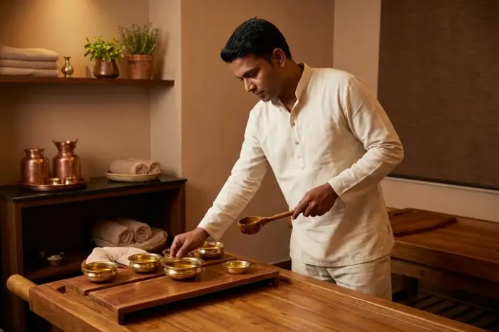 Master the ancient art of Abhyanga massage using warm herbal oils to relieve deep physical and mental stress.